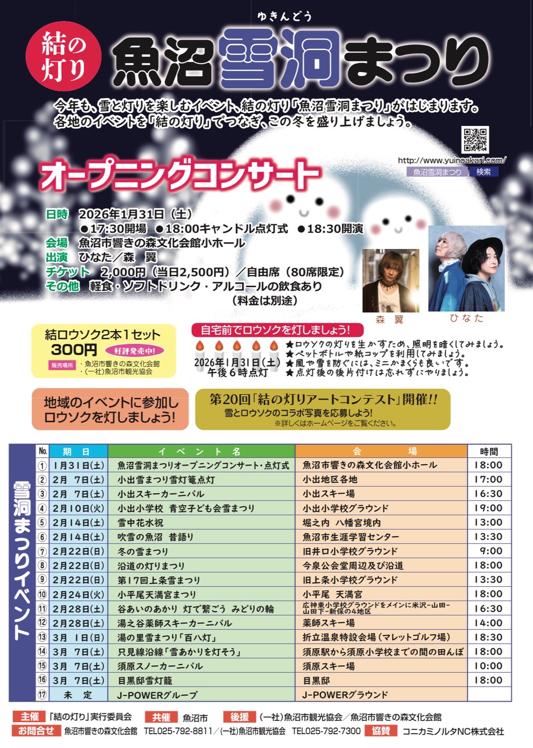 「結の灯り 魚沼雪洞まつり」 ■日時 2026年1月31日(土) 17:15 開場 18:00 雪洞まつり開会式 魚沼市長等のあいさつ 18:00 結ロウソク点灯式 18:30 コンサート開演 20:00 終演 ■会場 [...]