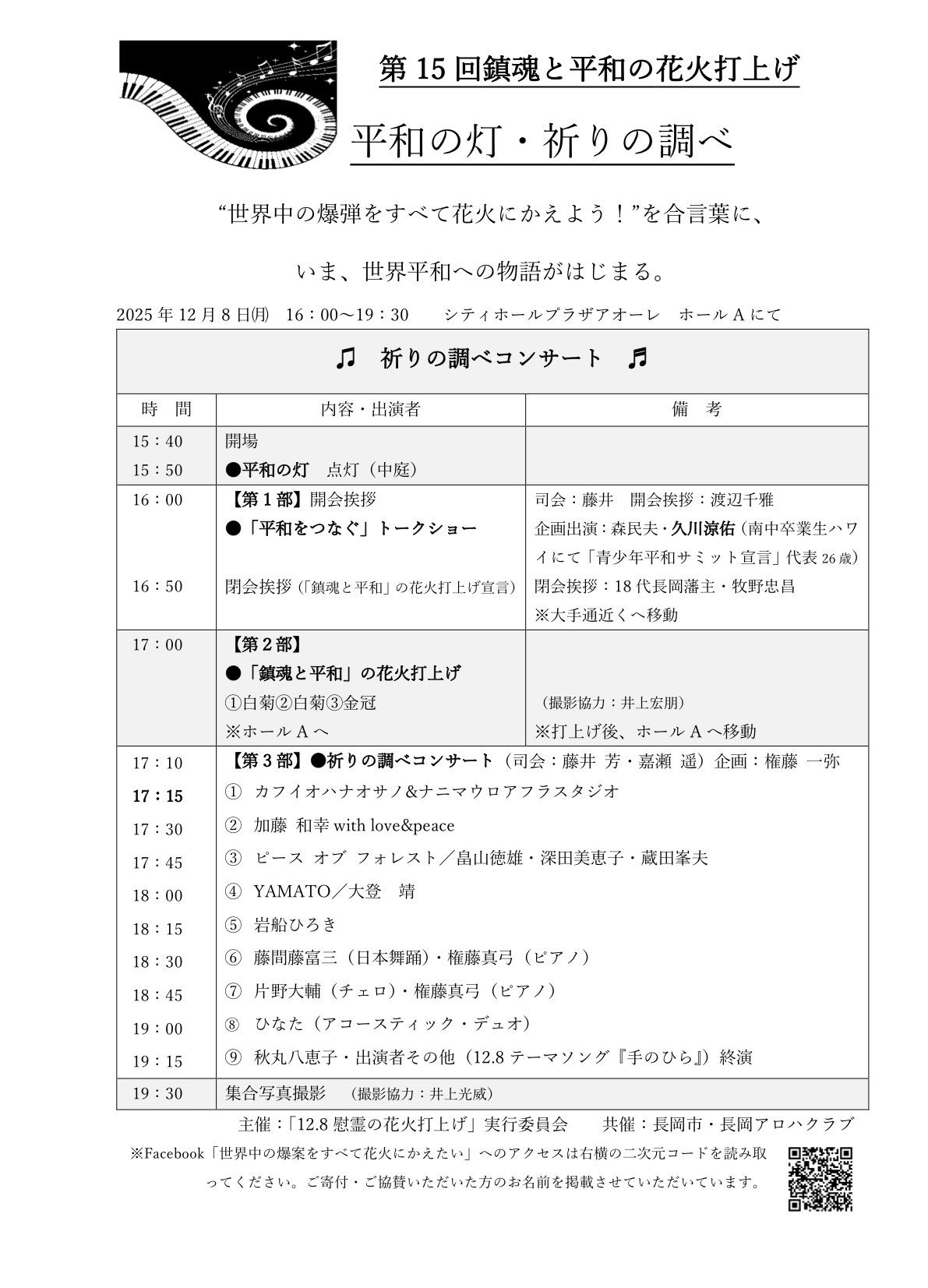 ■日時 2025年12月8日(月) 16:00~20:00 ■会場 新潟県長岡市大手通1-4-10/アオーレ長岡(市民交流ホールA) 第1部【「平和をつなぐ」トークショー・「平和の灯」点灯】 日米開戦84年、今なお世界の戦争は続く...「平和をつなぐ」トークショーを開催します。 舞台に飾られた中之島の大凧には当会の合言葉『世界中の爆弾をすべて花火にかえよう!』が揮毫されています。 ●開催時間:16時~ 第2部【鎮魂の花火「白菊】と平和の花火「金冠」打上げ】 [...]