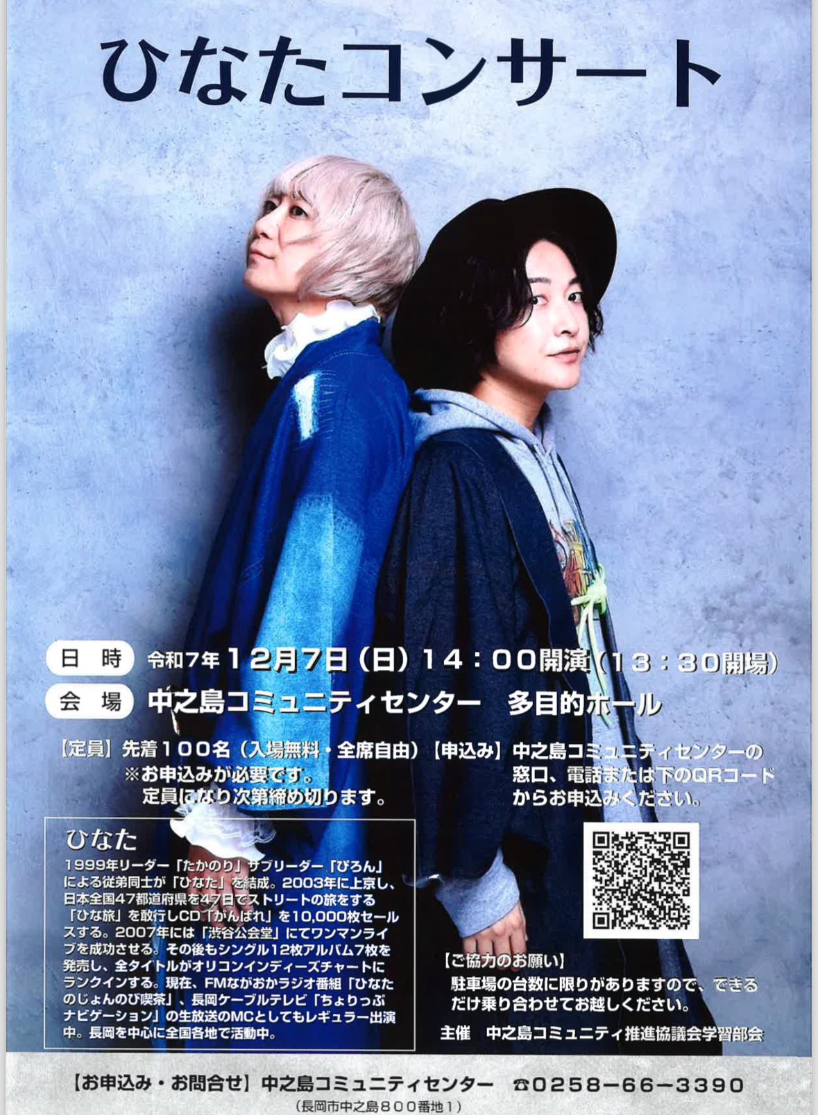 「ひなたコンサート」 ■日時 2025年12月7日(日) 13:30/14:00 ■会場 中之島コミュニティセンター 多目的ホール ※先着100名 ※入場無料・全席自由 事前申込必要 [...]