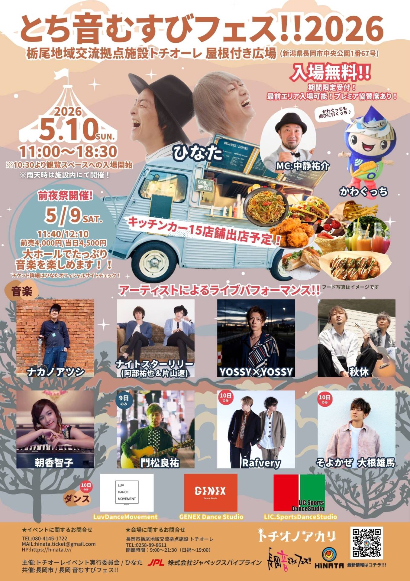 「とち音むすびフェス!!2026」 ここでしか味わえない栃尾の魅力が詰まったトチオーレにて野外フェス開催決定! 山に囲まれた雄大な会場にて最高の音楽!そしてキッチンカー15台! 心もお腹も満たされるハッピーな縁結びフェス! ■日時 2026年5月10日(日) 開場10:30/開演11:00 ※ライブ観覧エリアにはプレミア協賛チケットは整理番号順、通常入場は当日の整列順での入場となります。 ※イベント終了は18:30頃を予定しています。 ■会場 [...]