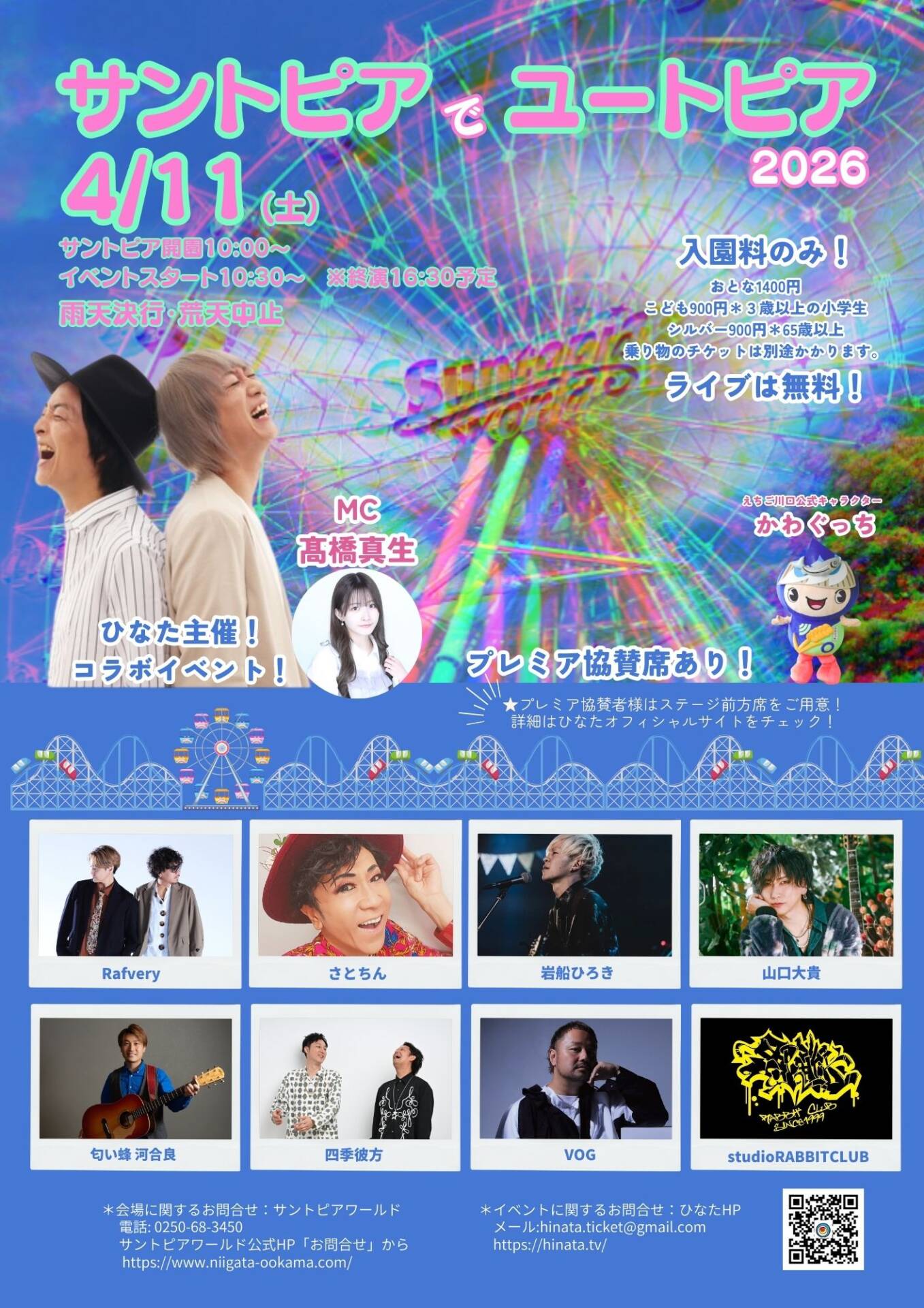 「サントピアでユートピア2026」 生まれ育った新潟の夢の国!!水と緑と太陽のユートピア!!「サントピアワールド」さんとコラボイベント開催決定!!! 音楽にダンス!そして遊園地で夢の体験をお届けします!! ■日時 2026年4月11日(土) サントピア開園10:00~/イベントスタート10:30~ ※終演16:30予定 *サントピアワールドの営業時間とは異なります。フェスを楽しみながら遊園地を存分にご堪能ください♪ (遊園地は16時閉園です) *雨天決行・荒天中止 [...]