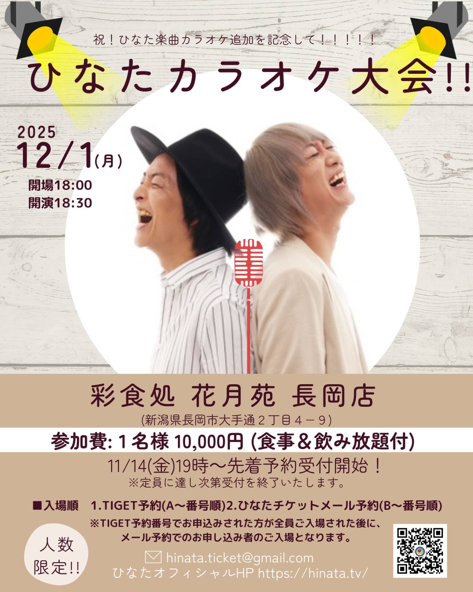 「ひなたカラオケ大会!!」 ひなたの楽曲がカラオケに入った事を記念したイベントが決定! ■日時 2025年12月1日(月) 開場18:00/開演18:30 終了20:30予定 ■会場 彩食処 花月苑 長岡店 [...]