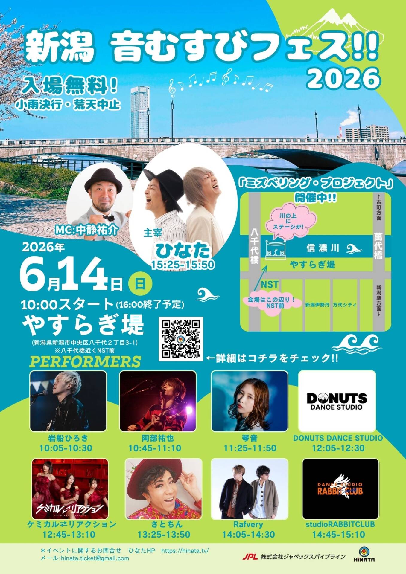 「新潟 音むすびフェス!!2026」 ■日時 2026年6月14日(日) ■会場 やすらぎ堤 (新潟県新潟市中央区八千代2丁目3-1) ※八千代橋近くNST前 ■出演者&出演時間 10:00-10:05 [...]