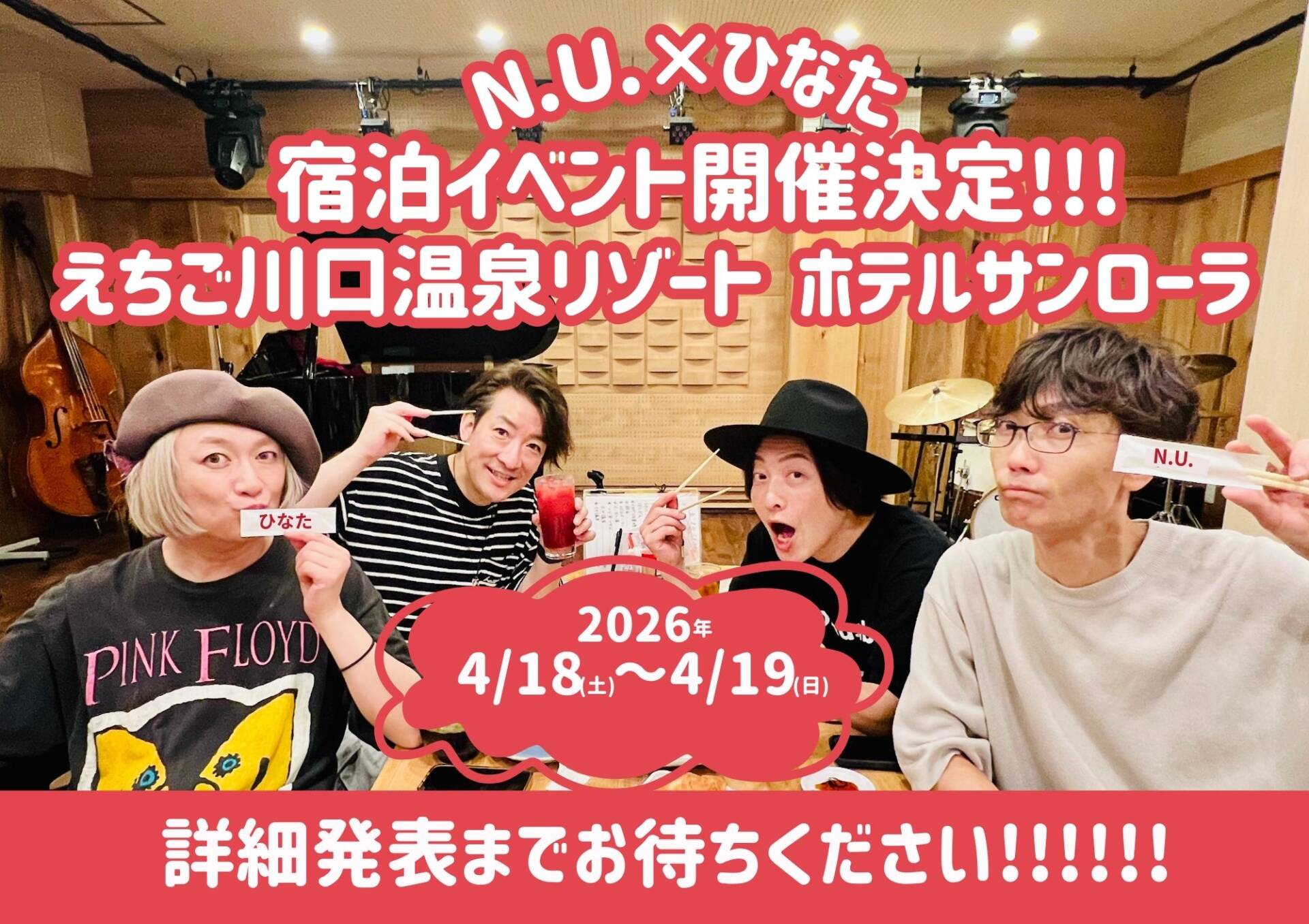 N.U.×ひなた 宿泊イベント! 「じょんのびーず温泉旅行~楽しすぎても、ええやん?inえちご川口温泉リゾート~」!! 2026年4月18日(土)・19日(日) えちご川口温泉リゾート ホテルサンローラ(新潟県長岡市) ★詳細発表までお待ちください!!!!