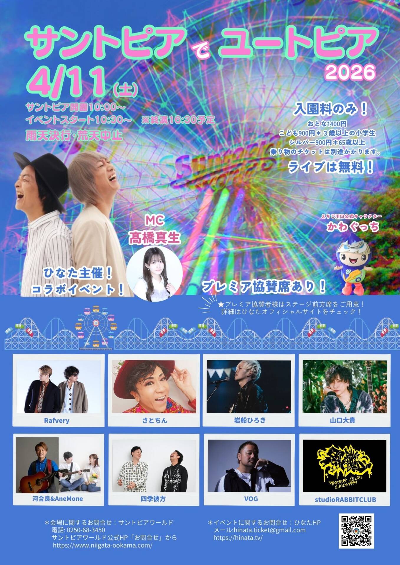 「サントピアでユートピア2026」 生まれ育った新潟の夢の国!!水と緑と太陽のユートピア!!「サントピアワールド」さんとコラボイベント開催決定!!! 音楽にダンス!そして遊園地で夢の体験をお届けします!! ■日時 2026年4月11日(土) サントピア開園10:00~/イベントスタート10:30~ ※終演16:30予定 *サントピアワールドの営業時間とは異なります。フェスを楽しみながら遊園地を存分にご堪能ください♪ (遊園地は16時閉園です) *雨天決行・荒天中止 [...]